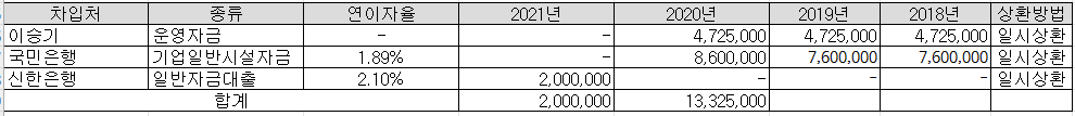이자비용이 2021년에 비정상적으로 증가했습니다. 22억원의 이자비용을 차입금 130억원으로 나누면 연 이자율이 거의 17%가까이 나오는데 이건 조금 이상한 것 같습니다. 일반차입금에 대한 이자비용 이외에 연체이자등에 대해 지급이 된건 아닐까 생각됩니다.
