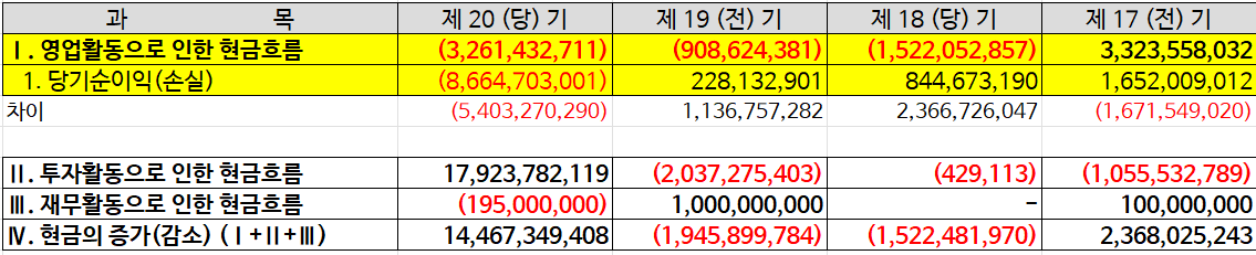 영업활동현금흐름을 보면 회사가 영 상태가 좋지 않음을 단번에 알 수 있습니다.