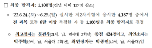 - 최고점자 : 문관우(21세, 남, 연세대 2학년) - 총점 424점