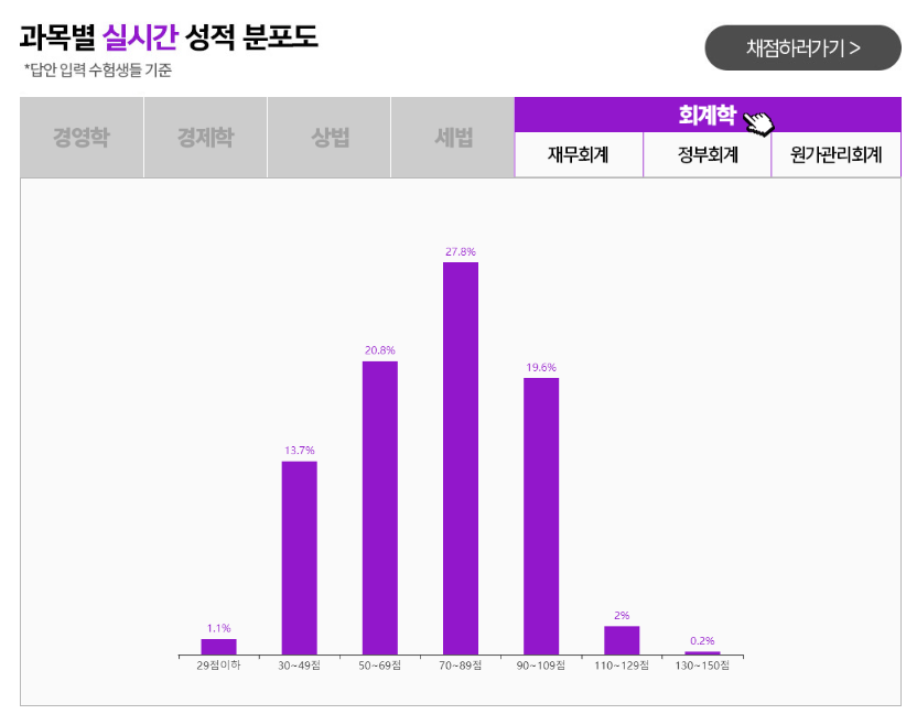 수능 시험 끝나면 수능 예상 등급컷을 알려주는 것처럼 해커스 공인회계사 사이트에서 가채점 결과에 대한 분석을 내 놓고 있는 걸 알게 되었습니다.