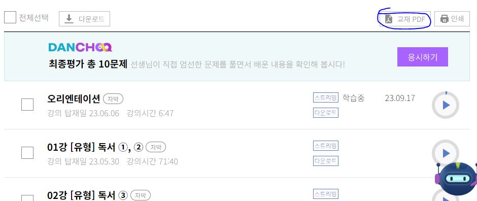 강의실에 들어가서 교재PDF 버튼을 클릭해주세요.