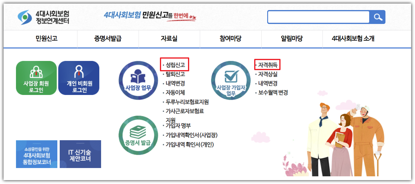 아래 4대보험정보연계센터 홈페이지에 접속하셔서 가입하신 후, 성립신고 및 자격취득 버튼 등을 클릭하시면 신고방법에 대해서 자세히 설명이 되어 있습니다.