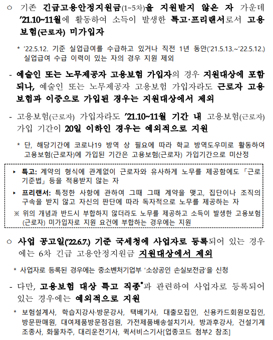 기존 긴급고용안정지원금(1~5차)을 지원받지 않은 자가운데 ’21.10~11월에 활동하여 소득이 발생한 특고·프리랜서로서 고용보험(근로자) 미가입자