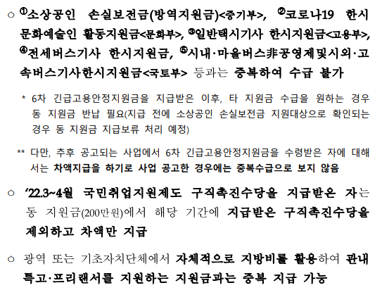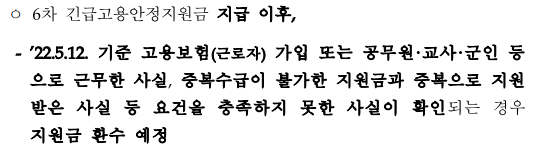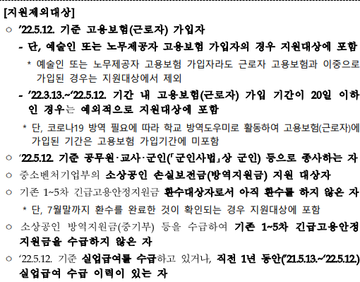 - 기존 긴급고용안정지원금(1~5차)을 지급받은 특고·프리랜서 중 ‘22.5.12 기준 고용보험(근로자)에 가입되어 있지 않은 자