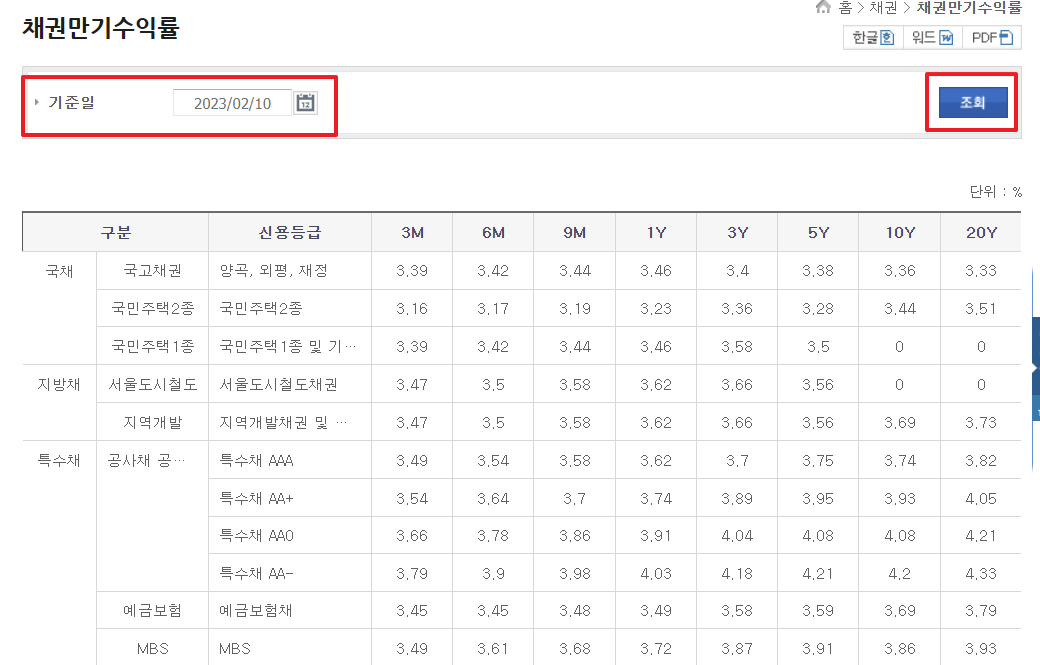 3단계 : 채권시가평가기준수익률 버튼을 클릭하고 조회합니다.